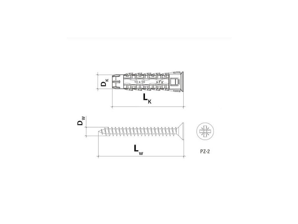 Uzlovacie hmoždiny SFX sú výrobkom renomovanej firmy Klimas Wkręt-met. Vyrobené sú z polyamidu. Hmoždinka má výstupky a stabilizačné rebrá, ktoré zabraňujú otáčaniu hmoždinky pri skrutkovaní a zaisťujú počiatočné upevnenie v zemi. Jedinečný tvar hmoždinky umožňuje inštaláciu ako do pevných materiálov (roztiahnutím objímky), tak aj do materiálov s dutinami (prostredníctvom tvarového spoja - zmrštením na "uzol").