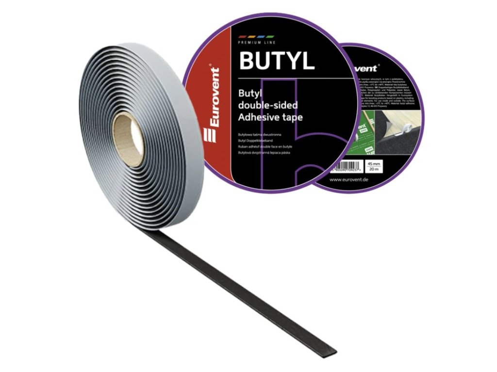 Obojstranná butylová páska Eurovent® BUTYL určená na lepenie a utesňovanie parozábran a strešných fólií, strešných membrán, základových fólií a iných stavebných výrobkov na báze plastov. Vyrobená je na báze butylu, bez rozpúšťadiel, chránená vrstvou fólie. Je to produkt šetrný k človeku a životnému prostrediu.