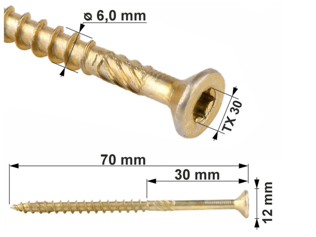 Zapustená hlava umožňuje úplné zahĺbenie hlavičky do upevňovacieho prvku. Hniezdo TORX zaisťuje optimálny prenos krútiaceho momentu.